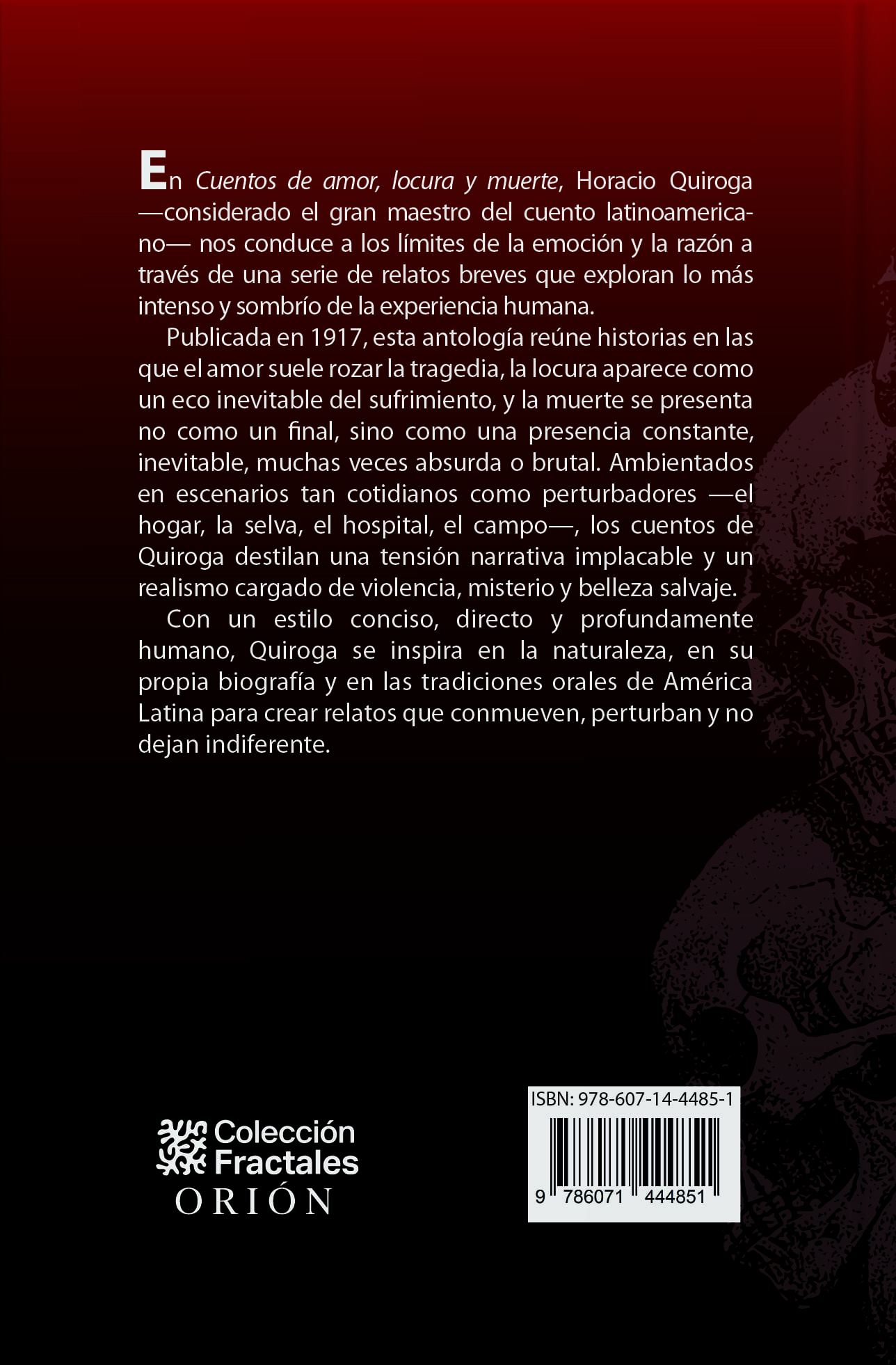En Cuentos de amor, locura y muerte, Horacio Quiroga, considerado el gran maestro del cuento latinoamericano, nos conduce a los límites de la emoción y la razón a través de una serie de relatos breves que exploran lo más intenso y sombrío de la experiencia humana.