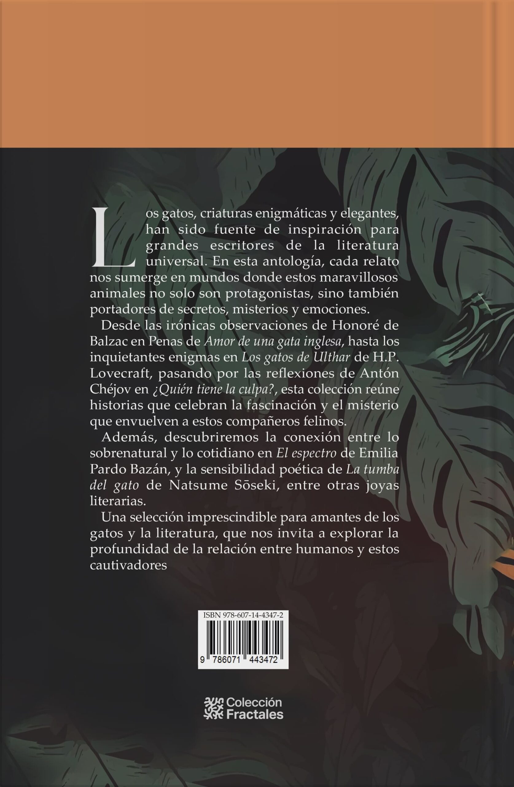 Desde las irónicas observaciones de Honoré de Balzac en Penas de Amor de una gata inglesa, hasta los inquietantes enigmas en Los gatos de Ulthar de H.P. Lovecraft, pasando por las reflexiones de Antón Chéjov en ¿Quién tiene la culpa?, esta colección reúne historias que celebran la fascinación y el misterio que envuelven a estos compañeros felinos. Además, descubriremos la conexión entre lo sobrenatural y lo cotidiano en El espectro de Emilia Pardo Bazán, y la sensibilidad poética de La tumba del gato de Natsume Soseki, entre otras joyas literarias.