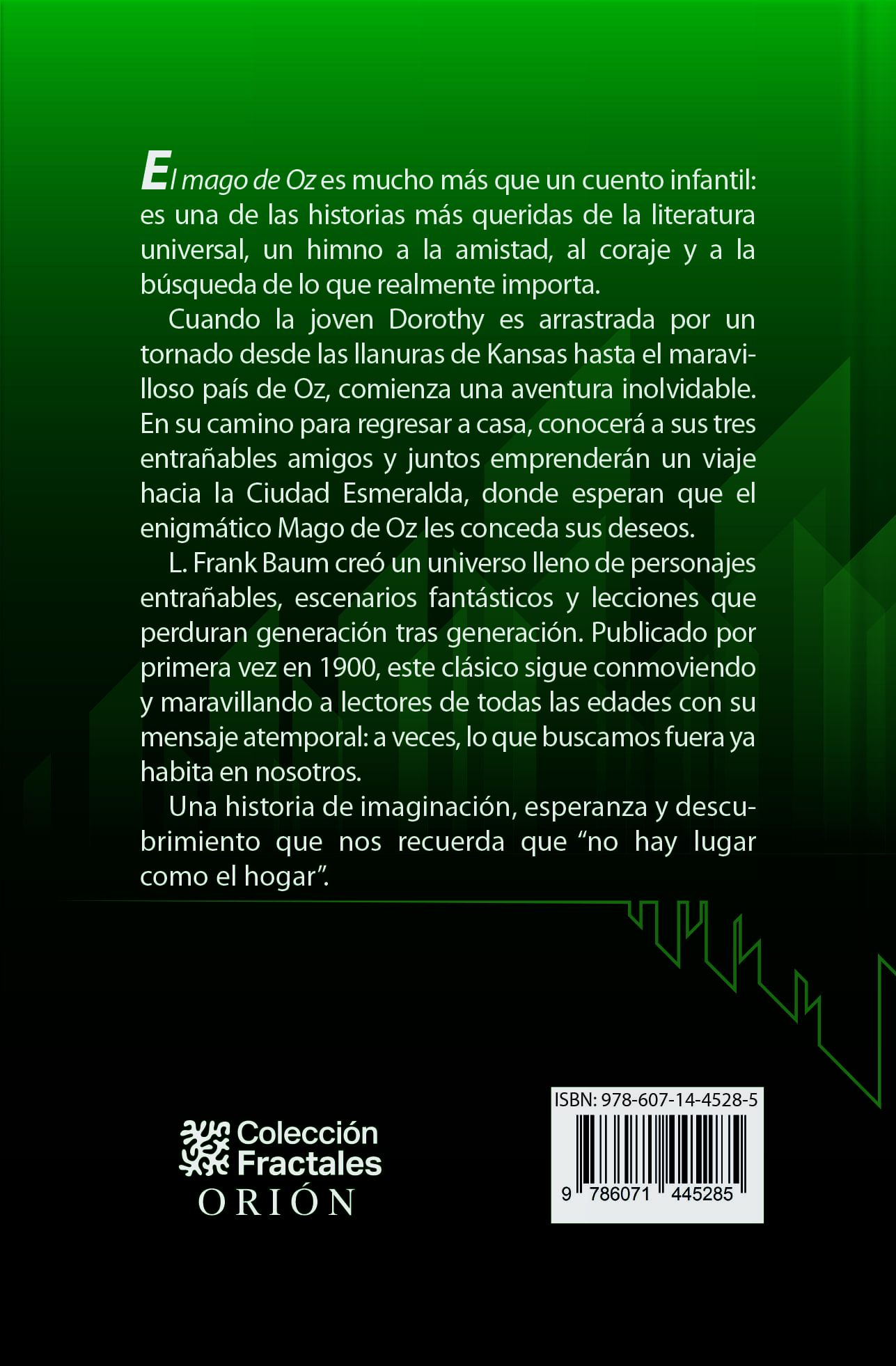Cuando la joven Dorothy es arrastrada por un tornado desde las llanuras de Kansas hasta el maravilloso país de Oz, comienza una aventura inolvidable. En su camino para regresar a casa, conocerá a sus tres entrañables amigos y juntos emprenderán un viaje hacia la Ciudad Esmeralda, donde esperan que el enigmático Mago de Oz les conceda sus deseos. L. Frank Baum creó un universo lleno de personajes entrañables, escenarios fantásticos y lecciones que perduran generación tras generación.
