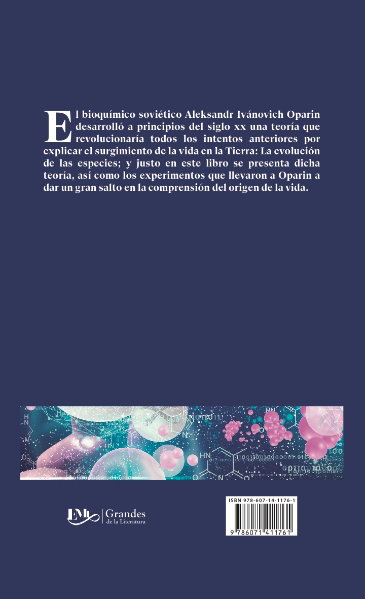 EI bioquímico soviético Aleksandr Ivánovich Oparin desarrolló a principios del siglo XX una teoría que revolucionaría todos los intentos anteriores por explicar el surgimiento de la vida en la Tierra: La evolución de las especies; y justo en este libro se presenta dicha teoría, así como los experimentos que llevaron a Oparin a dar un gran salto en la comprensión del origen de la vida.