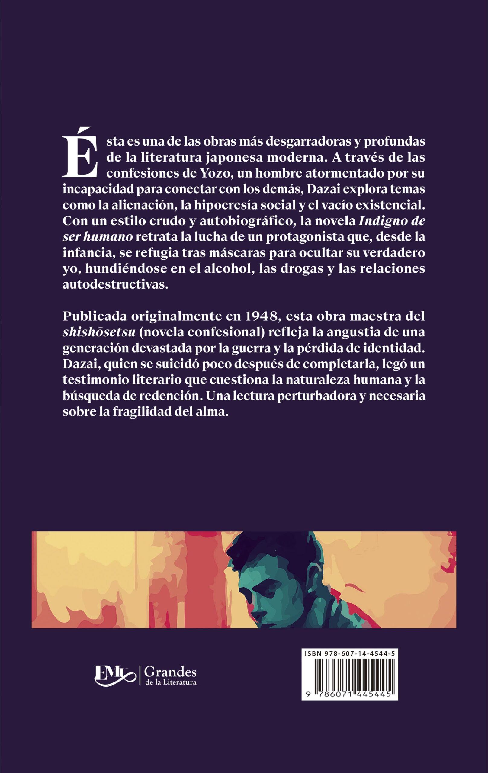 Con un estilo crudo y autobiográfico, la novela Indigno de ser humano retrata la lucha de un protagonista que, desde la infancia, se refugia tras máscaras para ocultar su verdadero yo, hundiéndose en el alcohol, las drogas y las relaciones autodestructivas.