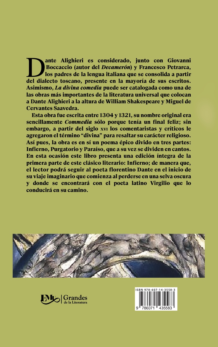 En esta ocasión este libro presenta una edición íntegra de la primera parte de este clásico literario: Infierno; de manera que, el lector podrá seguir al poeta florentino Dante en el inicio de su viaje imaginario que comienza al perderse en una selva oscura y donde se encontrará con el poeta latino Virgilio que lo conducirá en su camino.