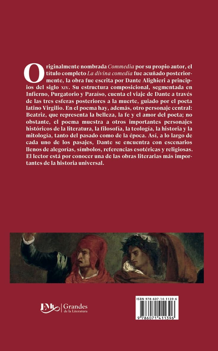 Dante Alighieri la escribió a principios del siglo XIV. Su estructura composicional, segmentada en Infierno, Purgatorio y Paraíso, cuenta el viaje de Dante a través de las tres esferas posteriores a la muerte, guiado por el poeta latino Virgilio.