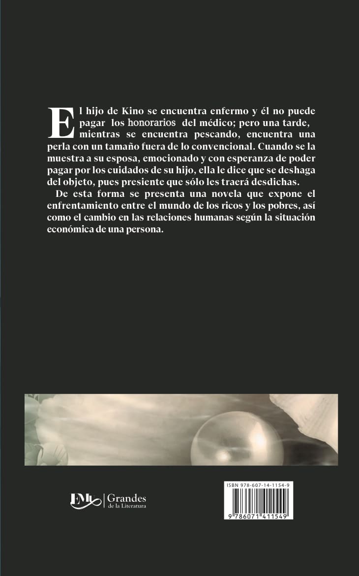 El hijo de Kino se encuentra enfermo y él no puede pagar los honorarios del médico; pero una tarde, mientras se encuentra pescando, encuentra una perla con un tamaño fuera de lo convencional.
