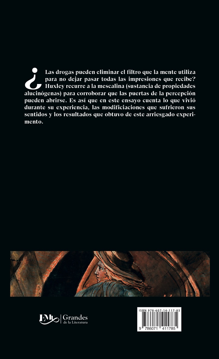 ¿Las drogas pueden eliminar el filtro que la mente utiliza para no dejar pasar todas las impresiones que recibe? Huxley recurre a la mezcalina (sustancia de propiedades alucinógenas) para corroborar que las puertas de la percepción pueden abrirse.