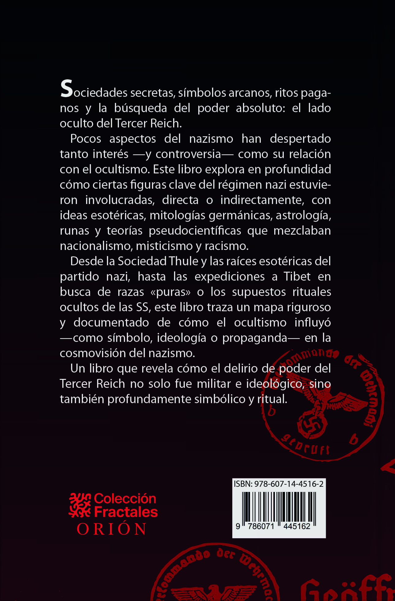 Pocos aspectos del nazismo han despertado tanto interés y controversia como su relación con el ocultismo. Este libro explora en profundidad cómo ciertas figuras clave del régimen nazi estuvieron involucradas, directa o indirectamente, con ideas esotéricas, mitologías germánicas, astrología, runas y teorías pseudocientíficas que mezclaban nacionalismo, misticismo y racismo.
