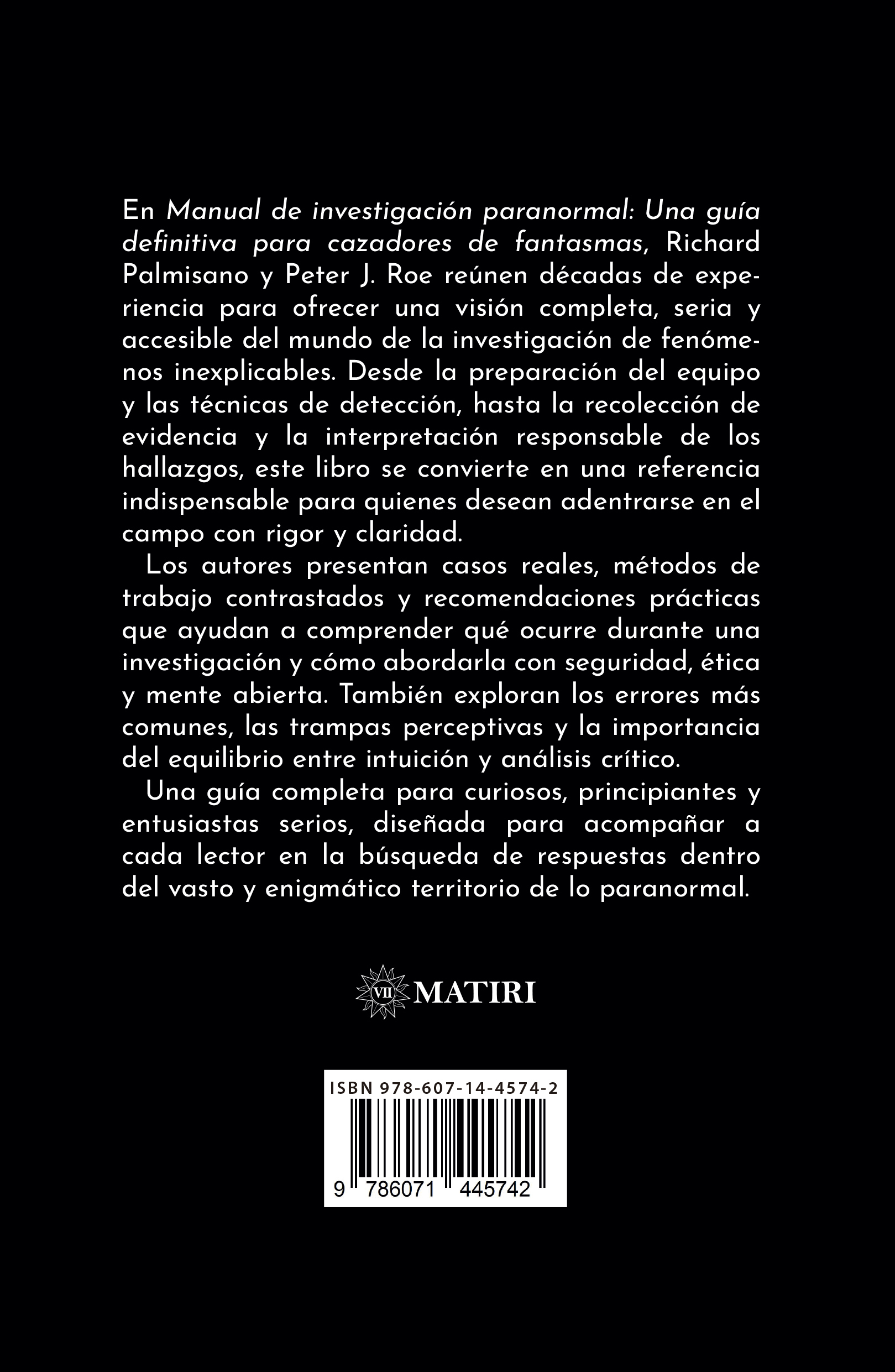 En Manual de investigación paranormal: Una guía definitiva para cazadores de fantasmas, Richard Palmisano y Peter J. Roe reúnen décadas de experiencia para ofrecer una visión completa, seria y accesible del mundo de la investigación de fenómenos inexplicables.