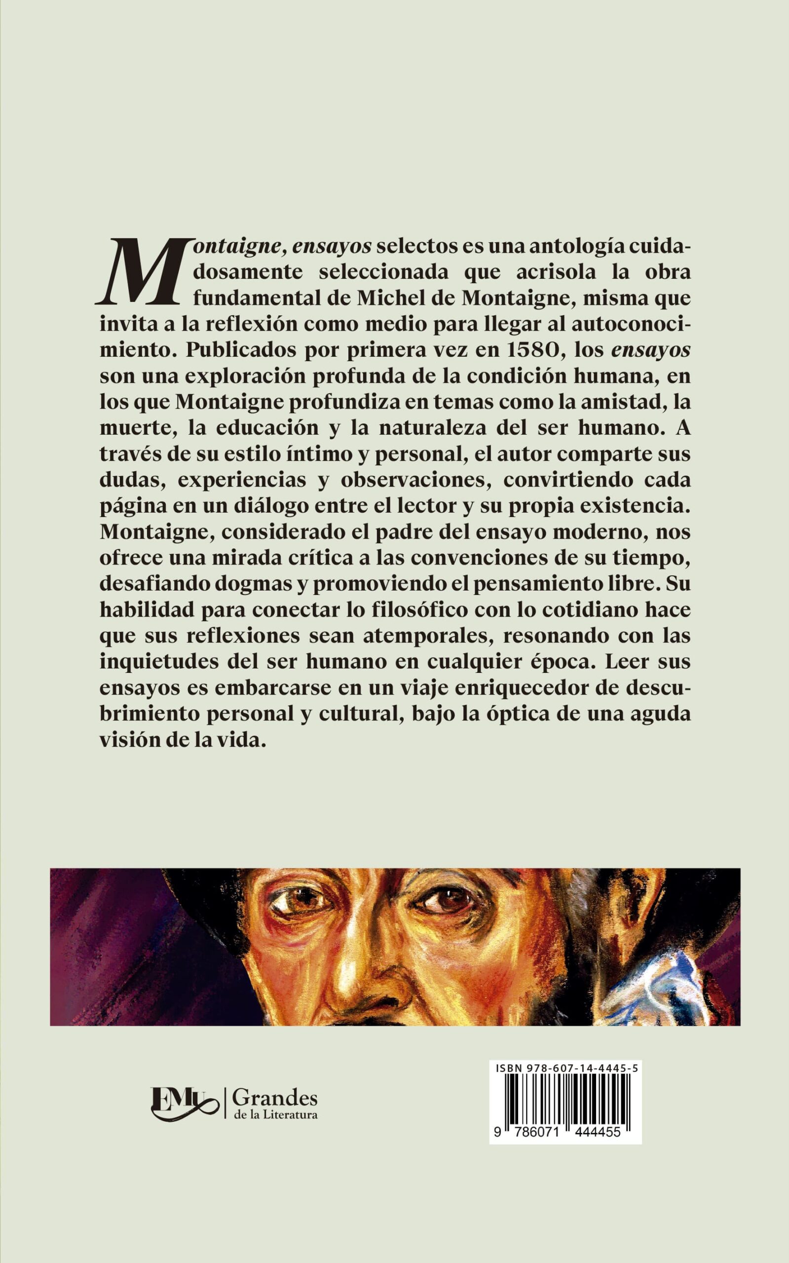 Montaigne, ensayos selectos es una antología cuidadosamente seleccionada que acrisola la obra fundamental de Michel de Montaigne, misma que invita a la reflexión como medio para llegar al autoconocimiento.