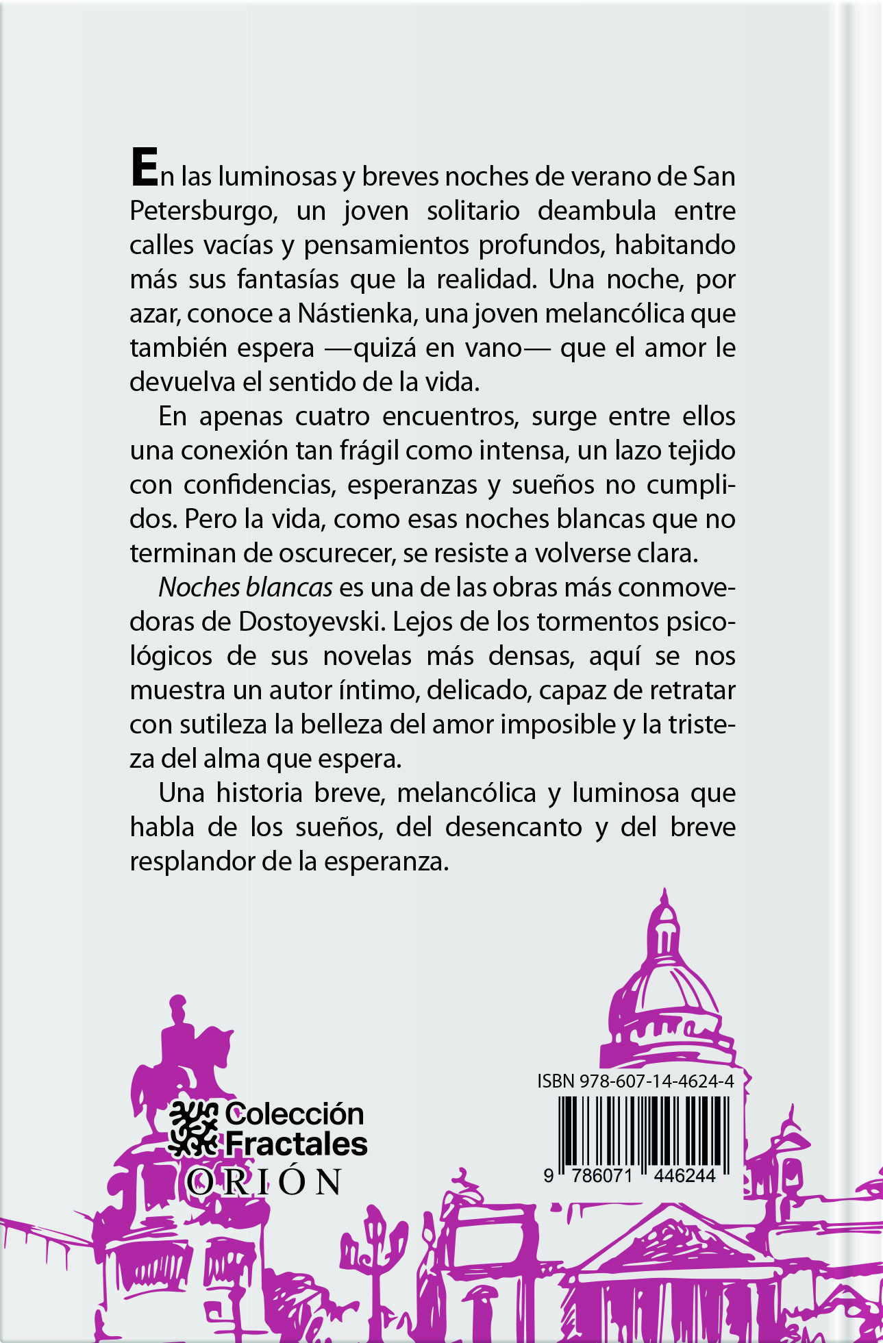 Noches blancas es una de las obras más conmovedoras de Dostoyevski. Lejos de los tormentos psicológicos de sus novelas más densas, aquí se nos muestra un autor íntimo, delicado, capaz de retratar con sutileza la belleza del amor imposible y la tristeza del alma que espera.